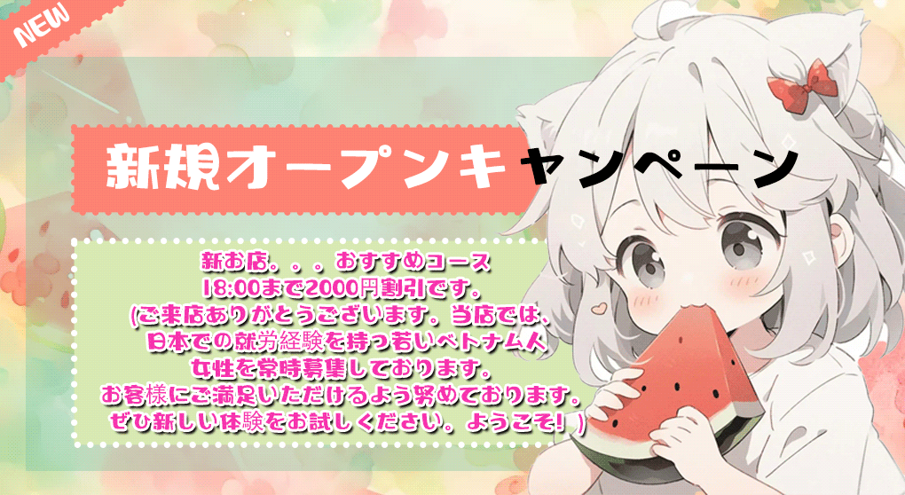 期待のキレカワフェイス入店!顔立ち全てから愛おしさがビンビンに感じられます♡可愛らしい見た目、思わず守ってあげたくなるような雰囲気、楽しい癒しの空間を作る才能の持ち主でございます。一度打ち解けた後の彼女から溢れ出す色気と心地よさは忘れられなくなることでしょう。